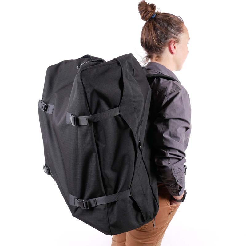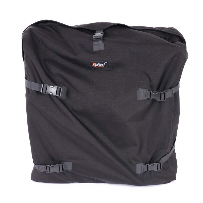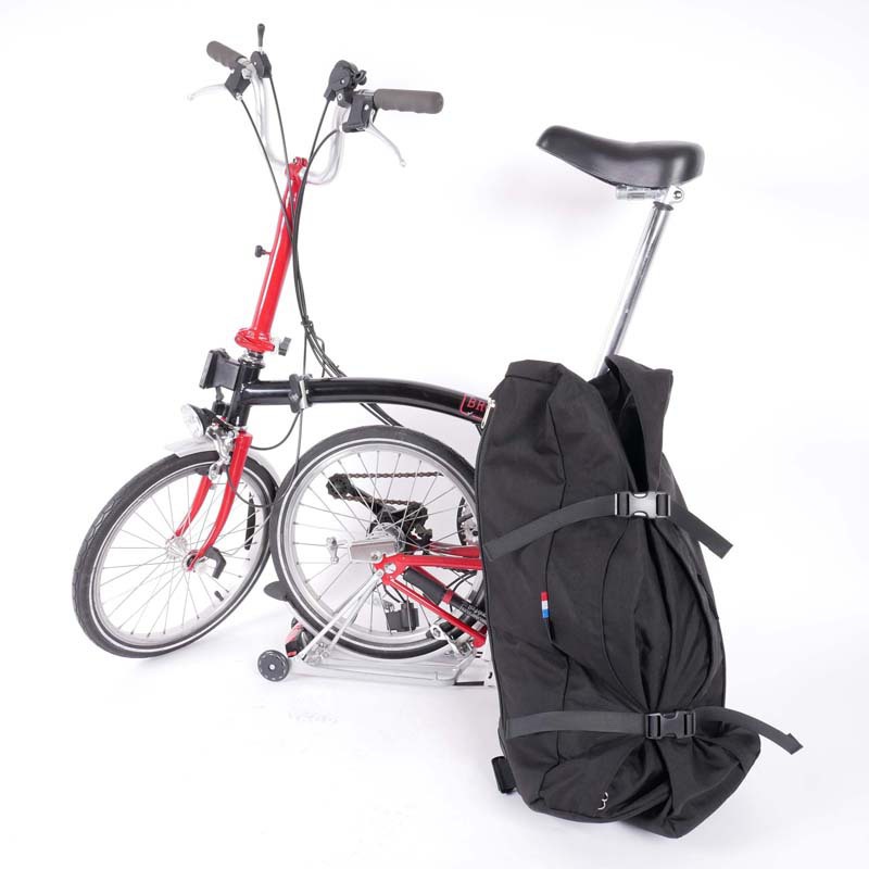Your Brompton can be completely stored in this backpack. After opening the long zipper you can put your Brompton inside. By closing the zipper and the buckles the backpack is ready to use. In some countries it is mandatory to store your folding bike in a bag in public transport.