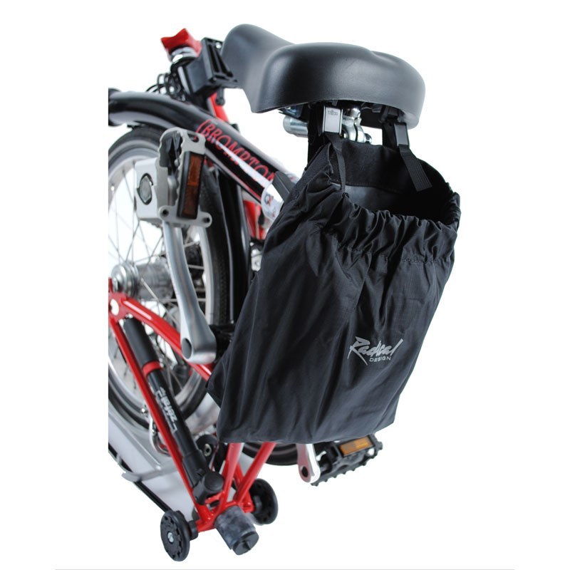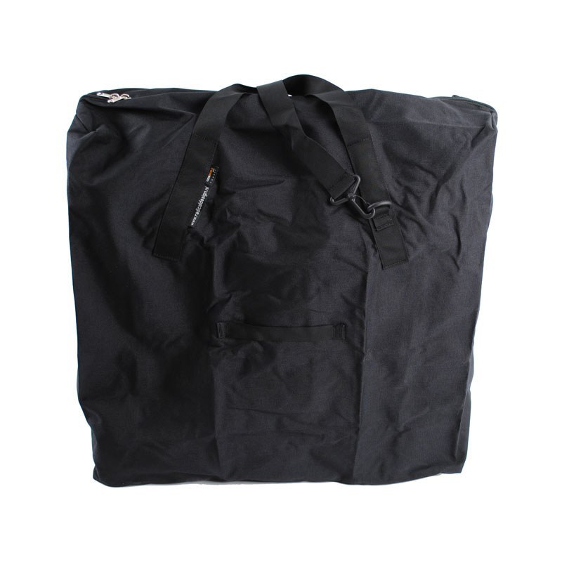 With the Brompton Transport Bag your Brompton (or other 16" folding bike) can be stored completely inside the bag, which is closed by a zip. In some countries this is obligatory for public transport. The only disadvantage of this bag, compared to the cover, is that the transport wheels cannot be used anymore and so the bike has to be carried. For this, two big handles are sewn onto the bag, and a strong 2" shoulder strap comes with it. The Brompton Transport Bag can be stored in a pouch that can be attached to the Brompton's saddle. Note: doesn't work with extended seat post, does work with telescopic seat post.