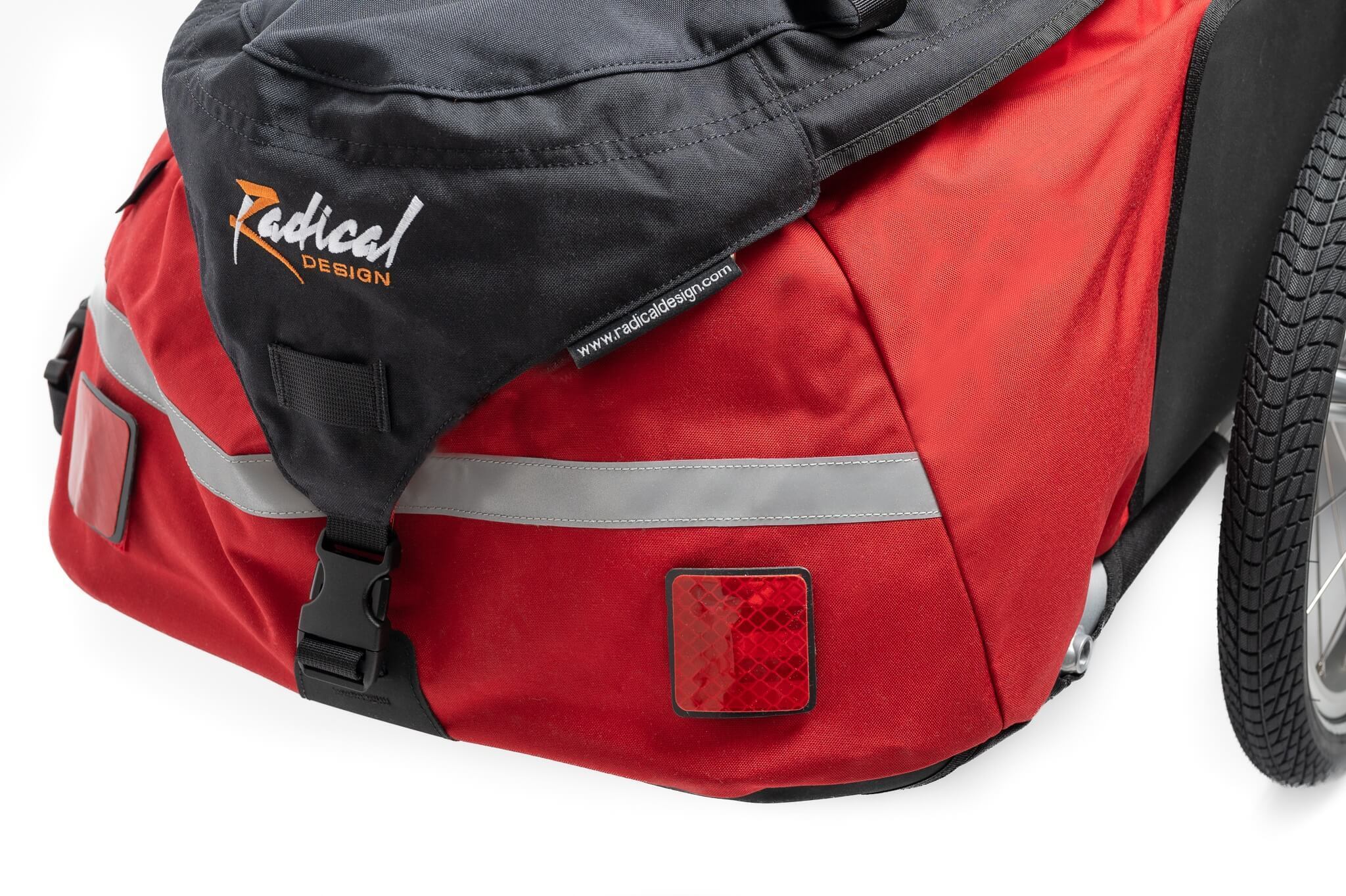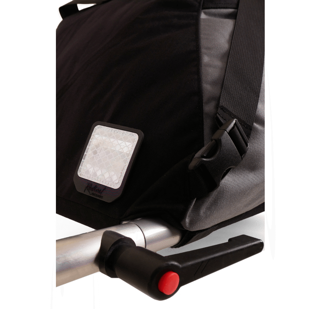 When transporting the Cyclone by train, tow-bar and wheels can be detached with a twist of the hand, which visually leaves only a big duffle bag. The optional wheel cover attaches the wheels to the duffle bag, the tow-bar can easily be stored inside. The shoulder strap and the two big handles make it easy to lift.