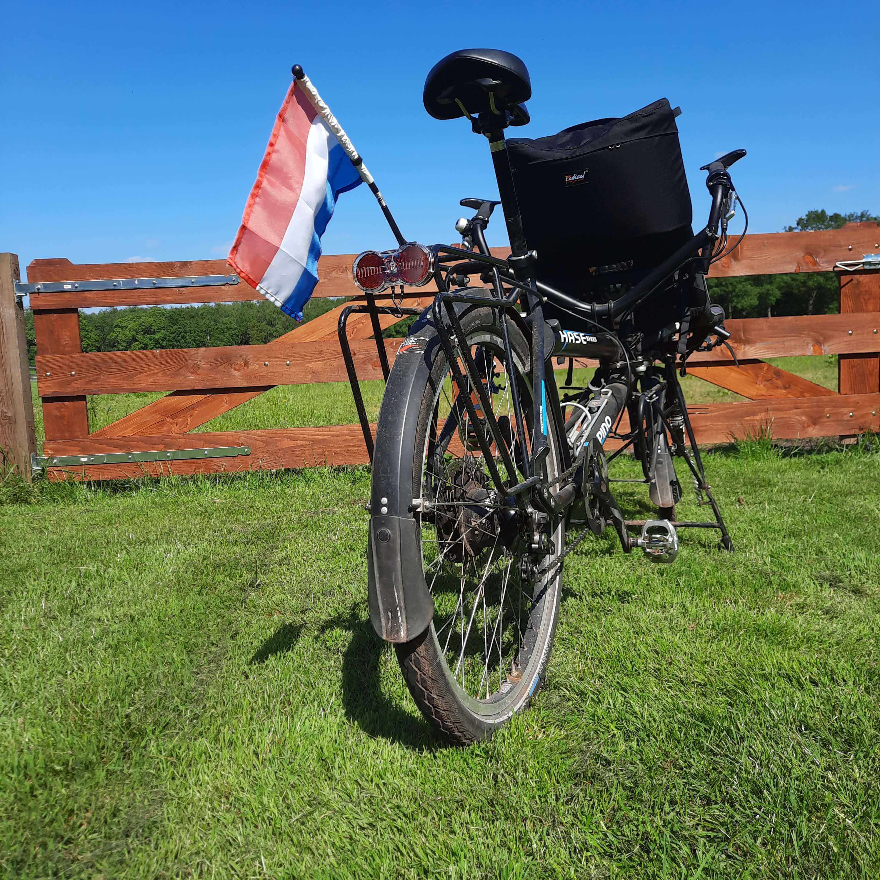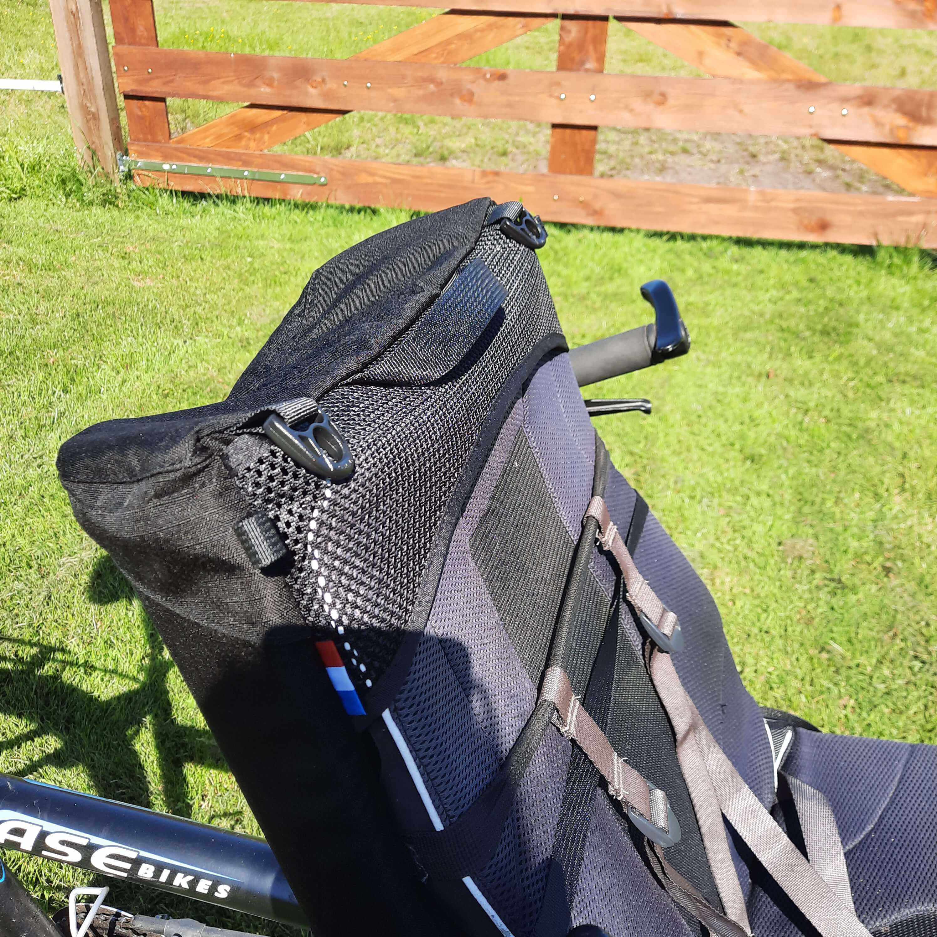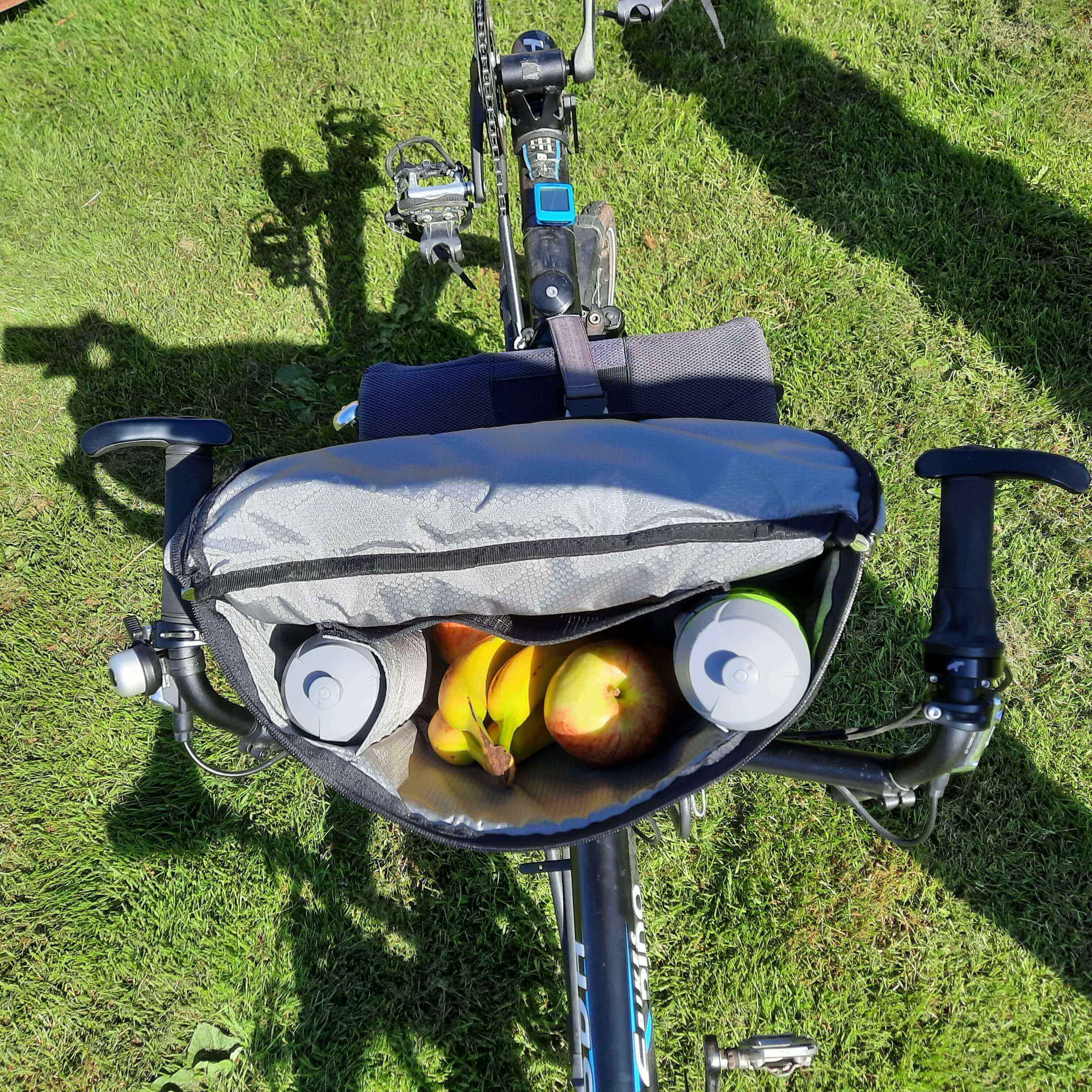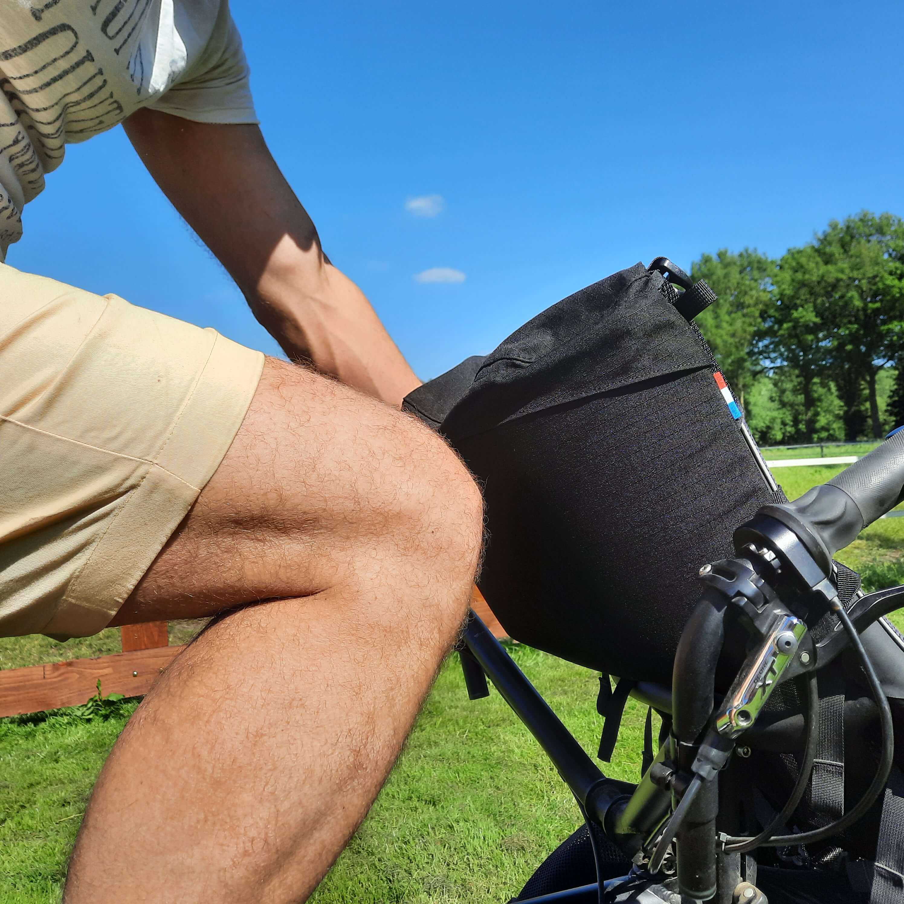 This bag is specially designed for Hase Pino bicycles. It is a bag that is attached to the front seat and is accessible for the rear cyclist. It is designed in a way that it does not hinder cycling, the legs do not touch the bag.