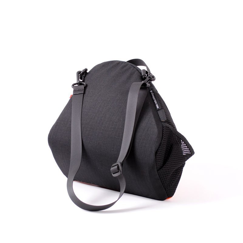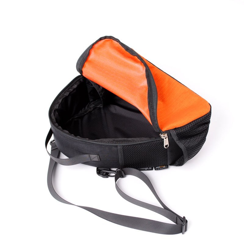 The Velomobile bag does for your velomobile what a handle bar bag does for your bike. It keeps small but important stuff organised. It is placed against the side wall, where it fits just between seat and front wheel. The Velomobile bag is almost fully reinforced with foam, in order to make it stand up against the wall by itself. The bottom is slanting slightly, making it follow well the shape of the hull and preventing it to tip over. On the outside of the bag there are two mesh pockets to store smalll items, inside the bag there is one more pocket for extra segragation.