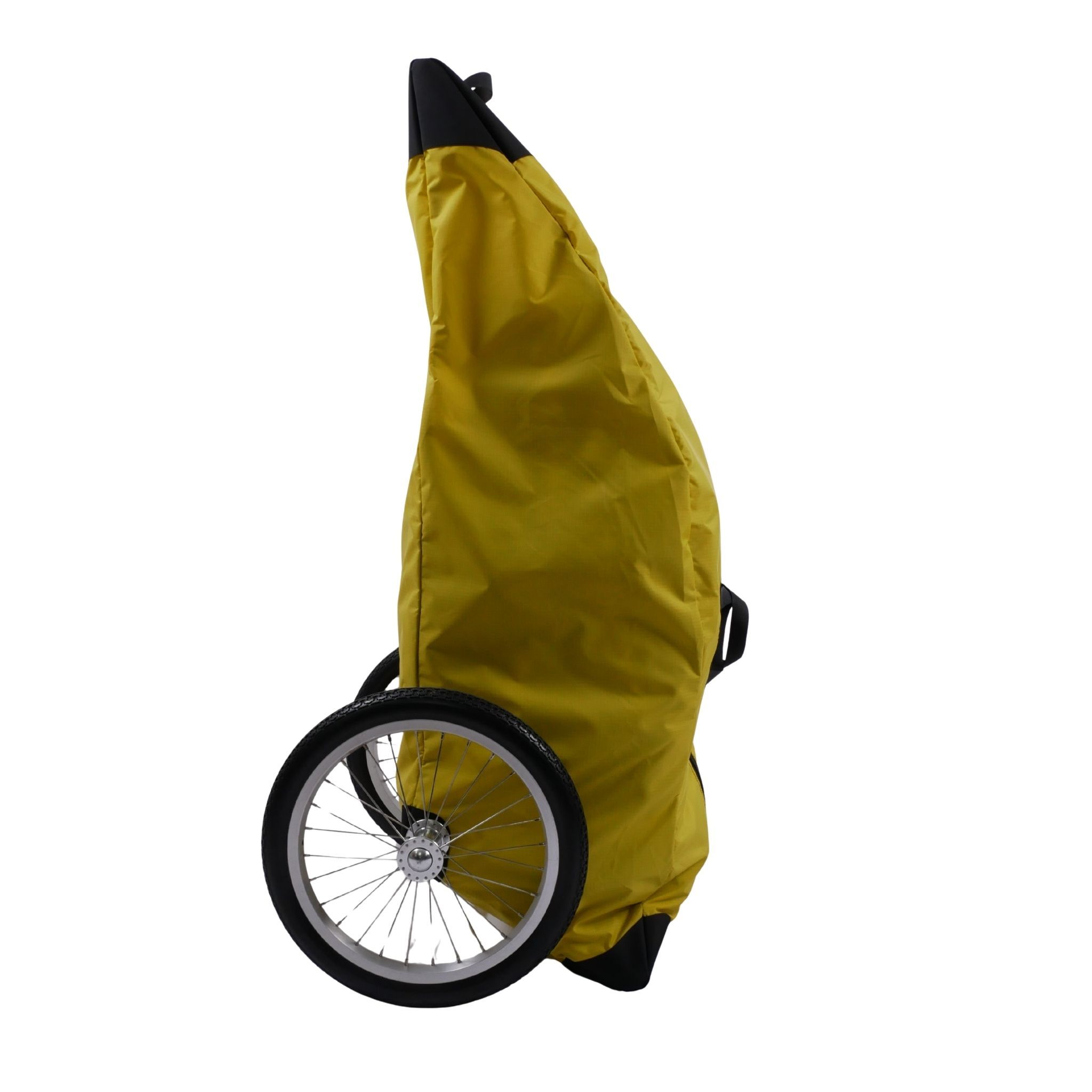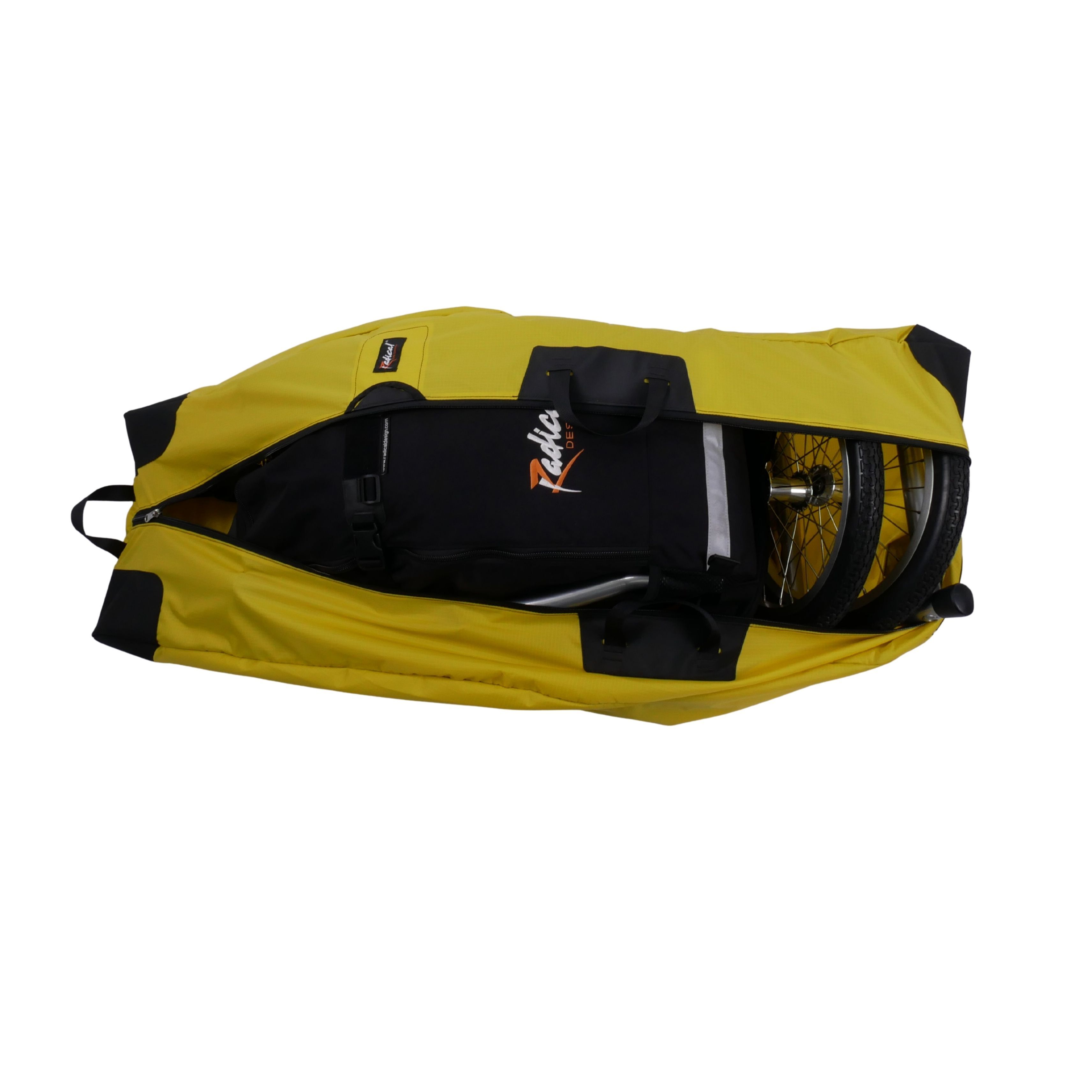 The Wheelie Flight Cover is engineered to protect and transport your Wheelie during air, rail, or bus travel. The cover accommodates the Wheelie with the towbars, wheels, and hip belt stored inside, while allowing the luggage to remain mounted on the frame. When required, the wheels can be attached so the trailer can be towed manually using the handle. The double sliders can be closed with a lock (not included).